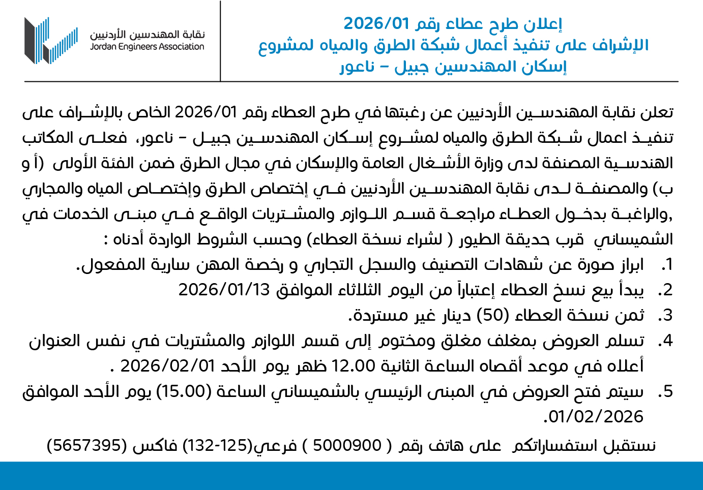 إعلان طرح عطاء رقم (01/2026) الإشراف على تنفيذ شبكة الطرق والمياه لمشروع إسكان المهندسين جبيل - ناعور