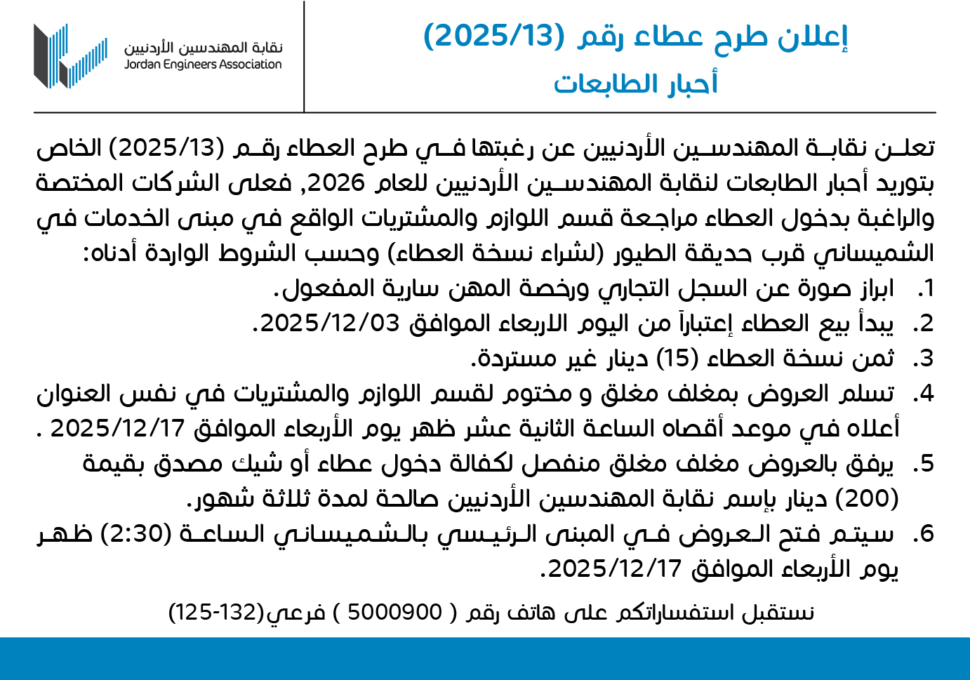 إعلان طرح عطاء رقم (13/2025) أحبار الطابعات