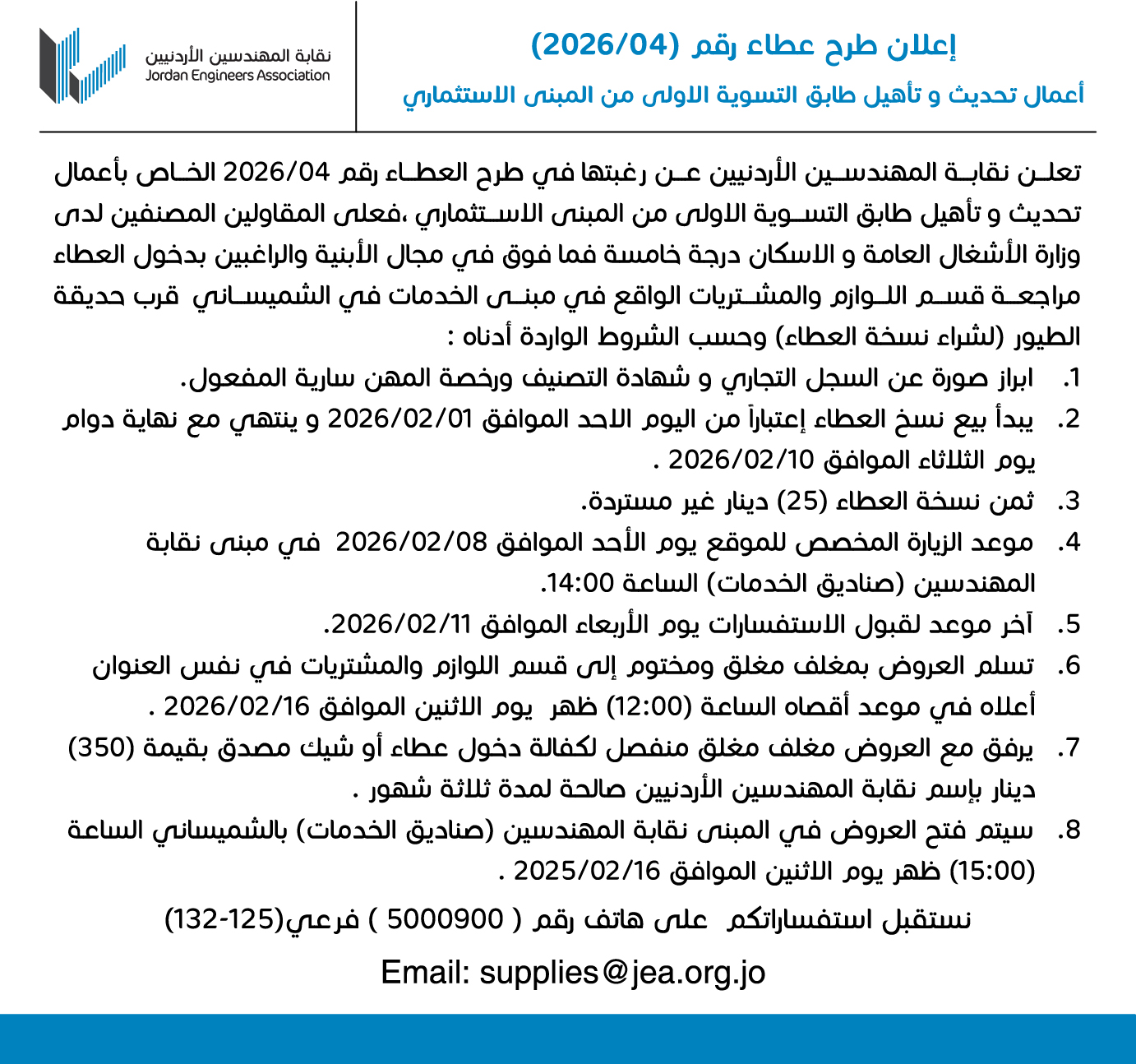 إعلان طرح عطاء رقم (04/2026) أعمال تحديث و تأهيل طابق التسوية الاولى من المبنى الاستثماري