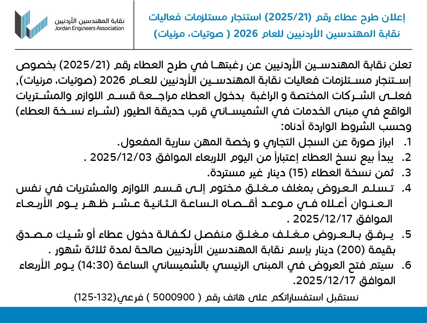 إعلان طرح عطاء رقم (21/2025) استئجار مستلزمات فعاليات نقابة المهندسين الأردنيين للعام 2026 (صوتيات، مرئيات)