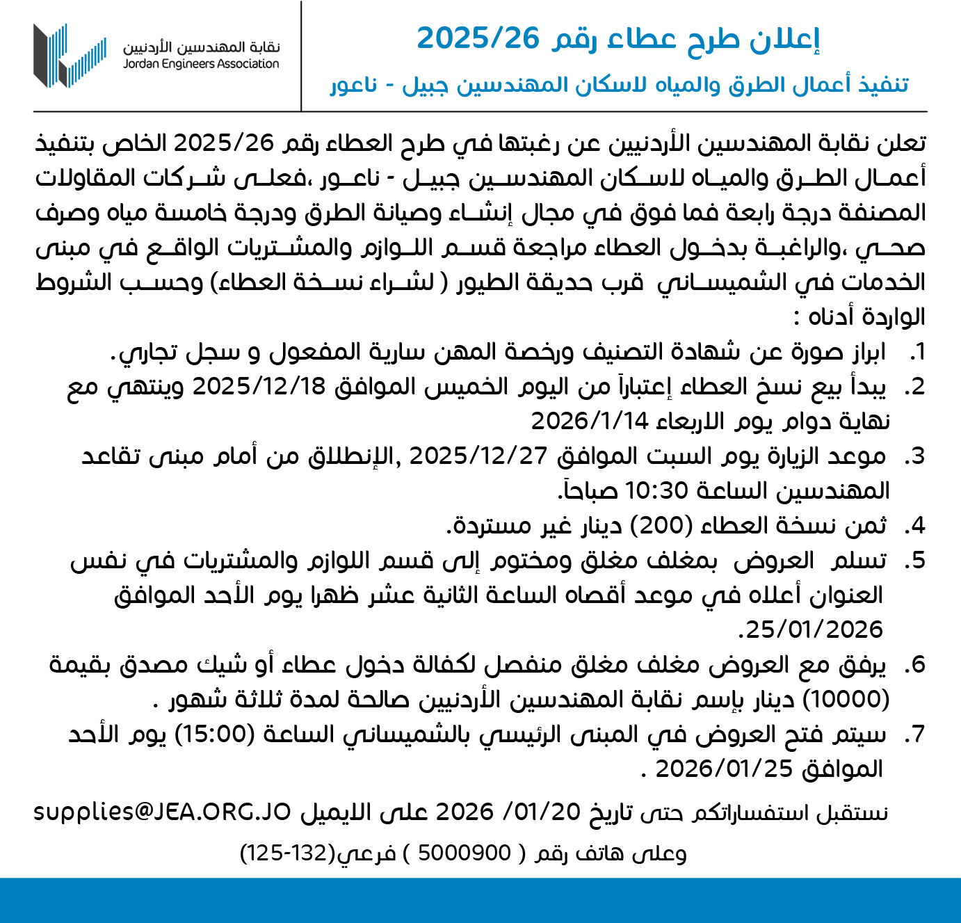 اعلان طرح عطاء رقم 26/2025 تنفيذ أعمال الطرق والمياه لاسكان المهندسين جبيل -ناعور