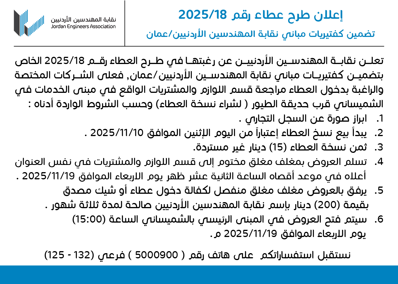 إعلان طرح عطاء رقم (18/2025) تضمين كفتيريات مباني نقابة المهندسين الأردنيين عمان