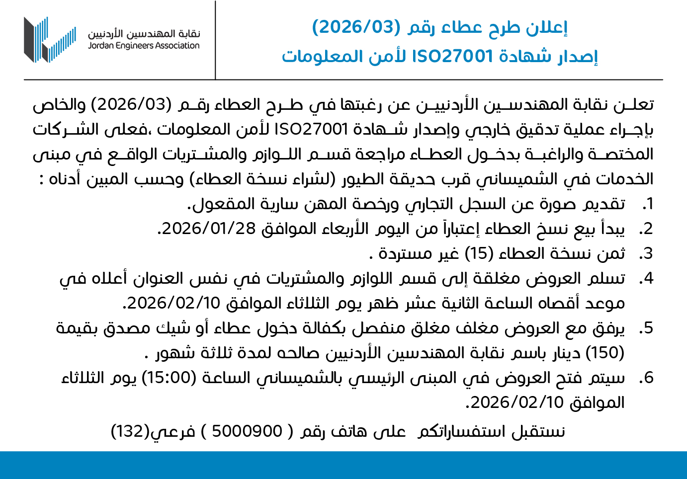 إعلان طرح عطاء رقم (03/2026) إصدار شهادة ISO27001 لأمن المعلومات